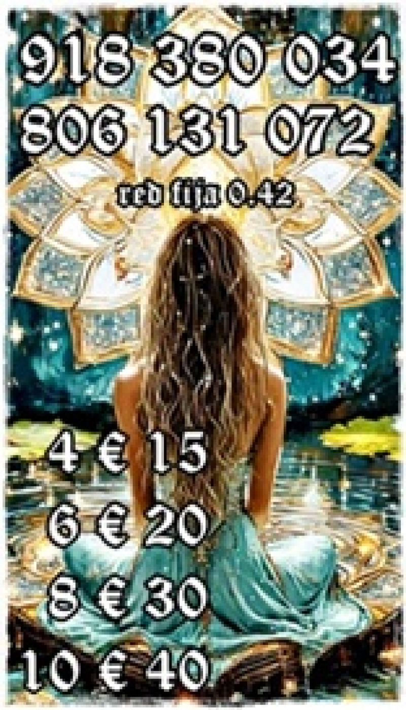 806002149 y 806131072 red fija 0.42 y red móvil 0.79 grandes ofertas de visa 932424782 / 918380034 y 932933512 por 4€ 15 -6€ 20 -10€ 40 m - 15 € 55 - 20 € 90 minutos el tarot es un espejo donde ves tu vida reflejada sin engaños y te ayuda a ver desde lejos lo que puedes hacer. por eso yo con mi videncia y el tarot te abrimos puertas nos, veras que no todas somos iguales. 24 horas sólo mayores de 18 años. servicio prestado.G.A.L. apartado de correos 164 (46002) valencia