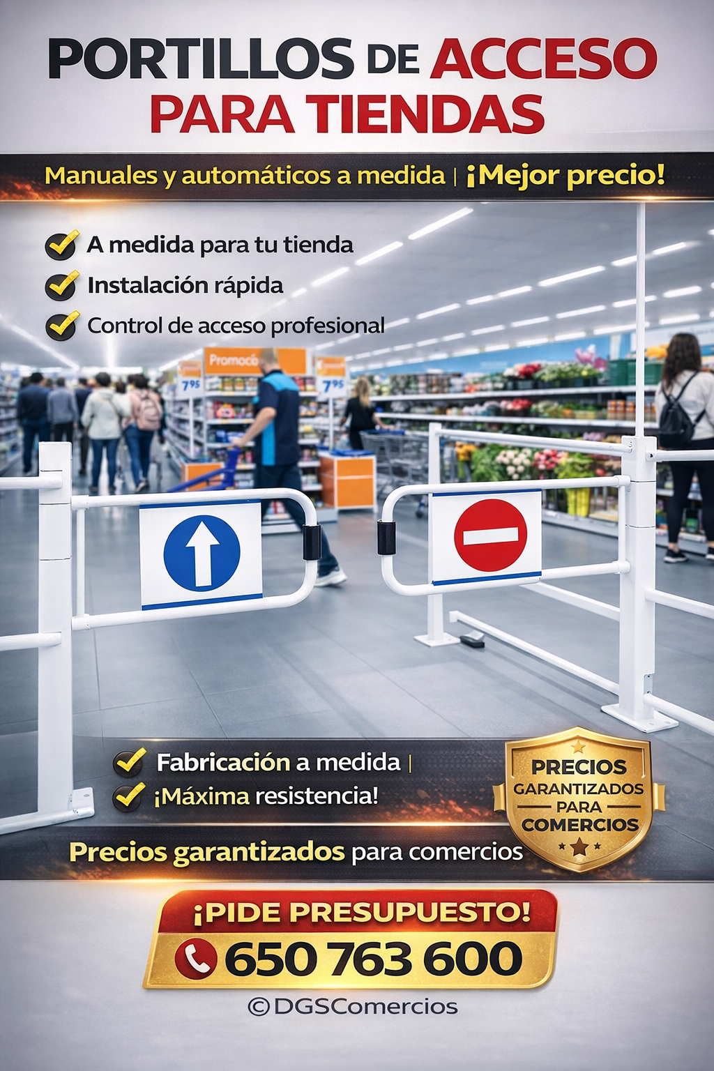 PORTILLOS barreras de acceso y portillos para controlar el paso en zonas. PORTILLOS ZONAS DE ACCESO PARA TIENDAS NUEVOS. DESDE 70cm por hoja desde 350€+iva, hasta portillos 2m de doble hoja manuales. SE HACEN A MEDIDA TEL. 650 763 600 También disponemos de automáticos, preguntarnos precios en oferta. - Estructura metálica. - Señalización de prohibido el paso y de dirección única.