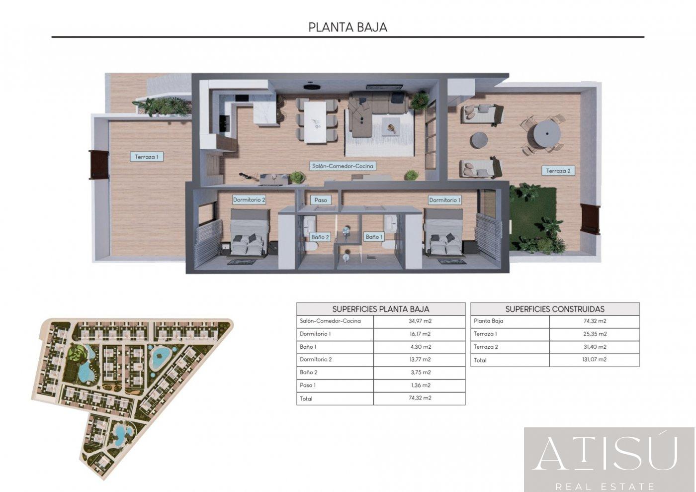 BUNGALOW EN ALICANTE,TORREVIEJABungalow 2 dormitorios, 2 baños, 0 garajes, , en Torrevieja, Alicante RESIDENCIAL DE OBRA NUEVA CONSTRUCCIÓN DE APARTAMENTOS BUNGALOW EN LOS BALCONES Residencial de nueva construcción en Los Balcones. El residencial consta de 136 apartamentos bungalow de lujo construidos con materiales de primera calidad. Cada uno de ellos tiene unas vistas mágicas a la Laguna Rosa de Torrevieja y al Mar Mediterráneo. Las viviendas tienen más de 131m2 distribuidos en un amplio salón-comedor con cocina americana, 2 amplios dormitorios y 2 baños completos. Puedes elegir entre bungalows de planta baja con sus 2 grandes terrazas privadas para disfrutar del clima de la Costa Blanca. O bungalows en primera planta de 178m2 con su solarium de 85m2 con vistas panorámicas a la Laguna Rosa y al Mar Mediterráneo El complejo ofrece idílicas zonas comunes ajardinadas con 3 zonas de piscina, zonas de jacuzzi, zona de fitness, pista de pádel, mini golf, zona infantil, punto de carga para vehículos eléctricos... ¡y mucho más! Sus instalaciones Premium y sus zonas verdes le permitirán disfrutar con su familia y amigos de los 320 días de sol que ofrece la Costa Blanca. Los Balcones se encuentra a las afueras de Torrevieja con todos los servicios accesibles, a sólo 5 minutos de la Playa de los Náufragos, de los supermercados, del colegio y del Centro Comercial La Zenia Boulevard, y a un minuto del Hospital Universitario de Torrevieja. Complejo situado a 40 minutos del aeropuerto de Alicante y a 1 hora del aeropuerto de Murcia - Corvera. |