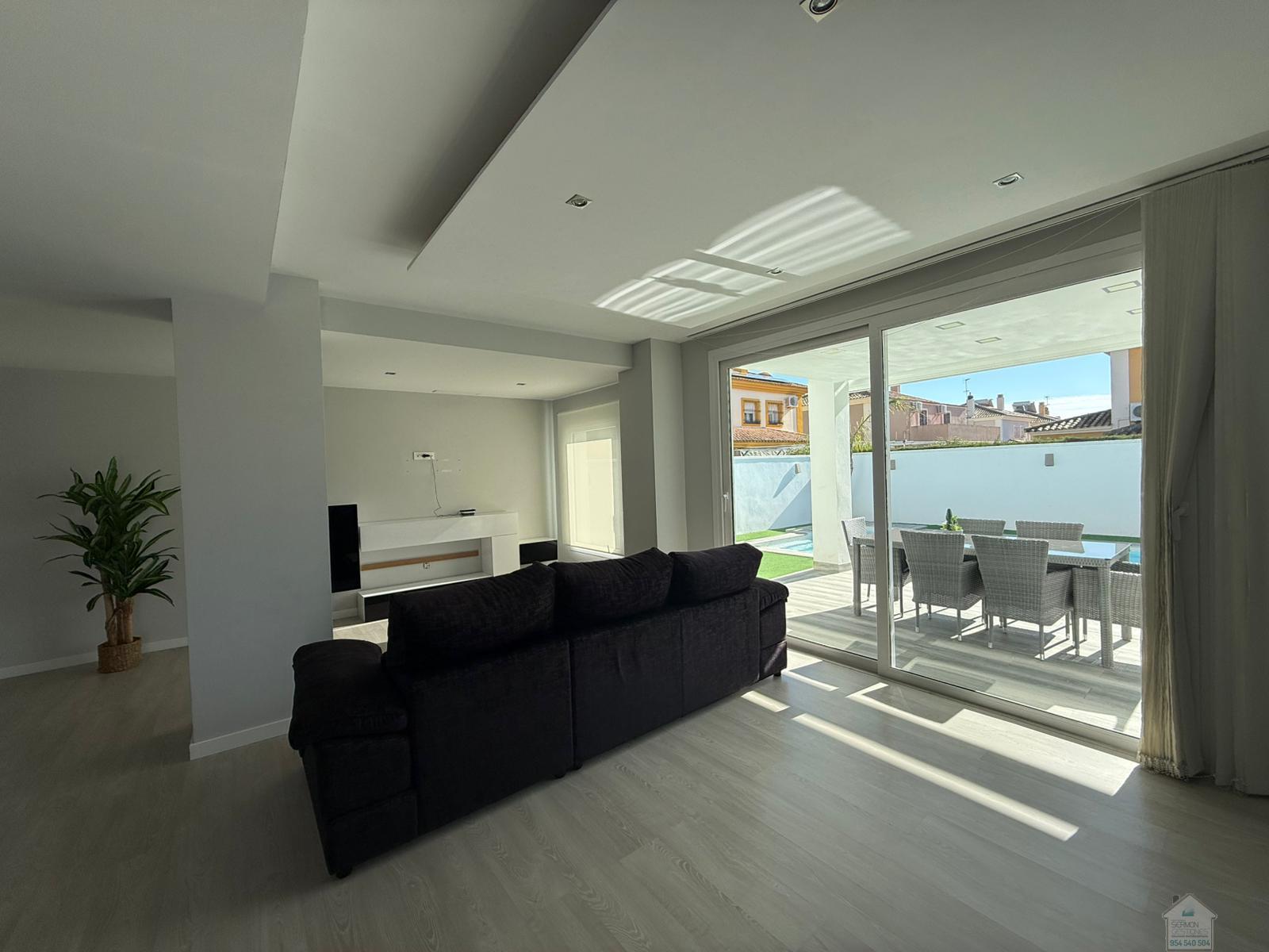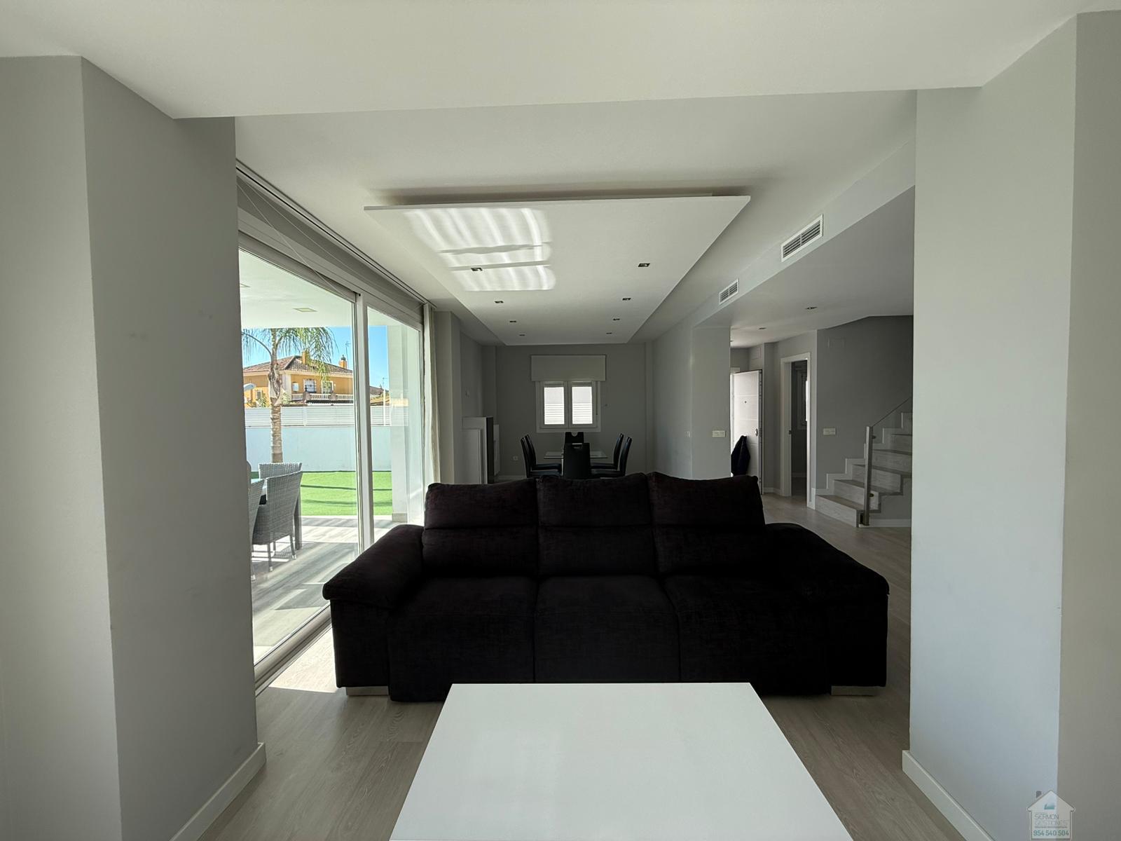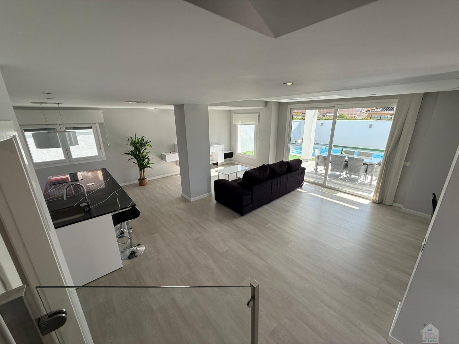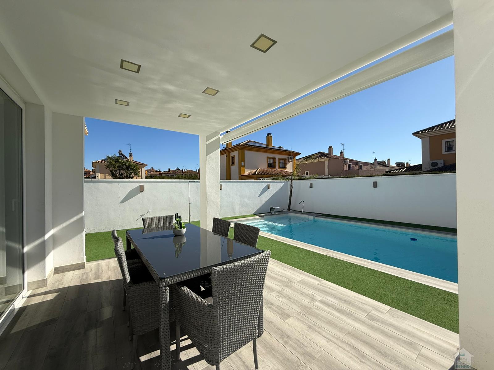 CHALET EN SEVILLA,DOS HERMANASChalet 5 dormitorios, 2 baños, 2 garajes, Buen estado, en Dos Hermanas, Sevilla Alquiler chalet independiente en Olivar de quintos, Montequinto. Situado dentro de un pasaje privado, ofreciendo tranquilidad, seguridad e intimidad. La vivienda consta de 230 metros cuadrados construidos y 418 metros de parcela. En su entrada, un recibidor que nos conduce al salón y cocina integrada, todo diáfano, luminoso y con salida al porche y piscina. En esta planta hay una habitación y un aseo. La planta superior cuenta con un distribuidor que nos dirige a cuatro habitaciones. Una de ellas la habitación principal, con baño propio y vestidor. El último de los baños también se encuentra en esta planta. La zona exterior, amplia, zona de estar cubierta y con una gran piscina en la que disfrutar de la familia y amigos. La casa cuenta con garaje cubierto y capacidad para dos/tres coches. Además, en la fachada de la vivienda, dentro del pasaje se puede también estacionar. No dudes en llamar y estaremos encantados de hacer una visita. |