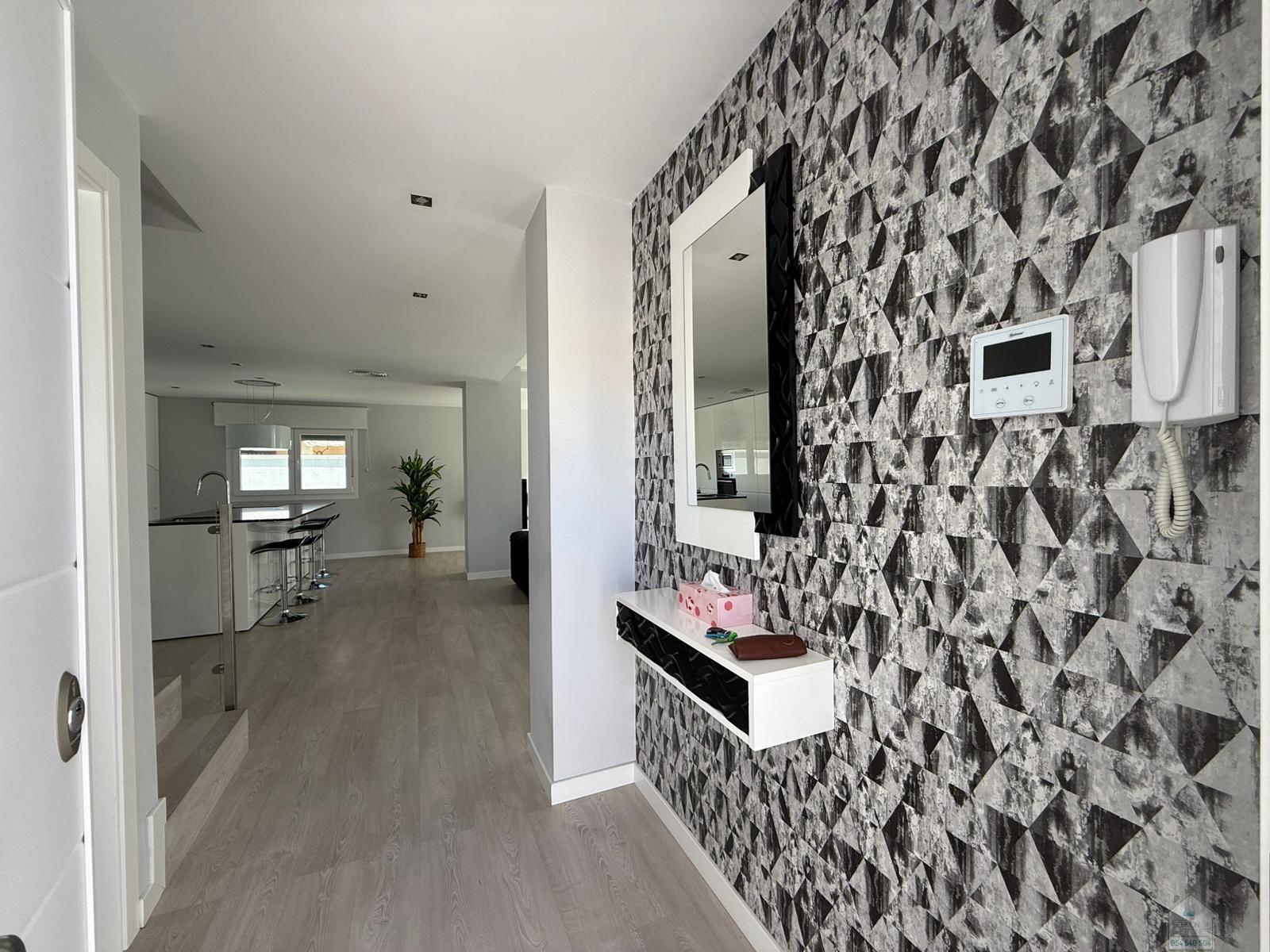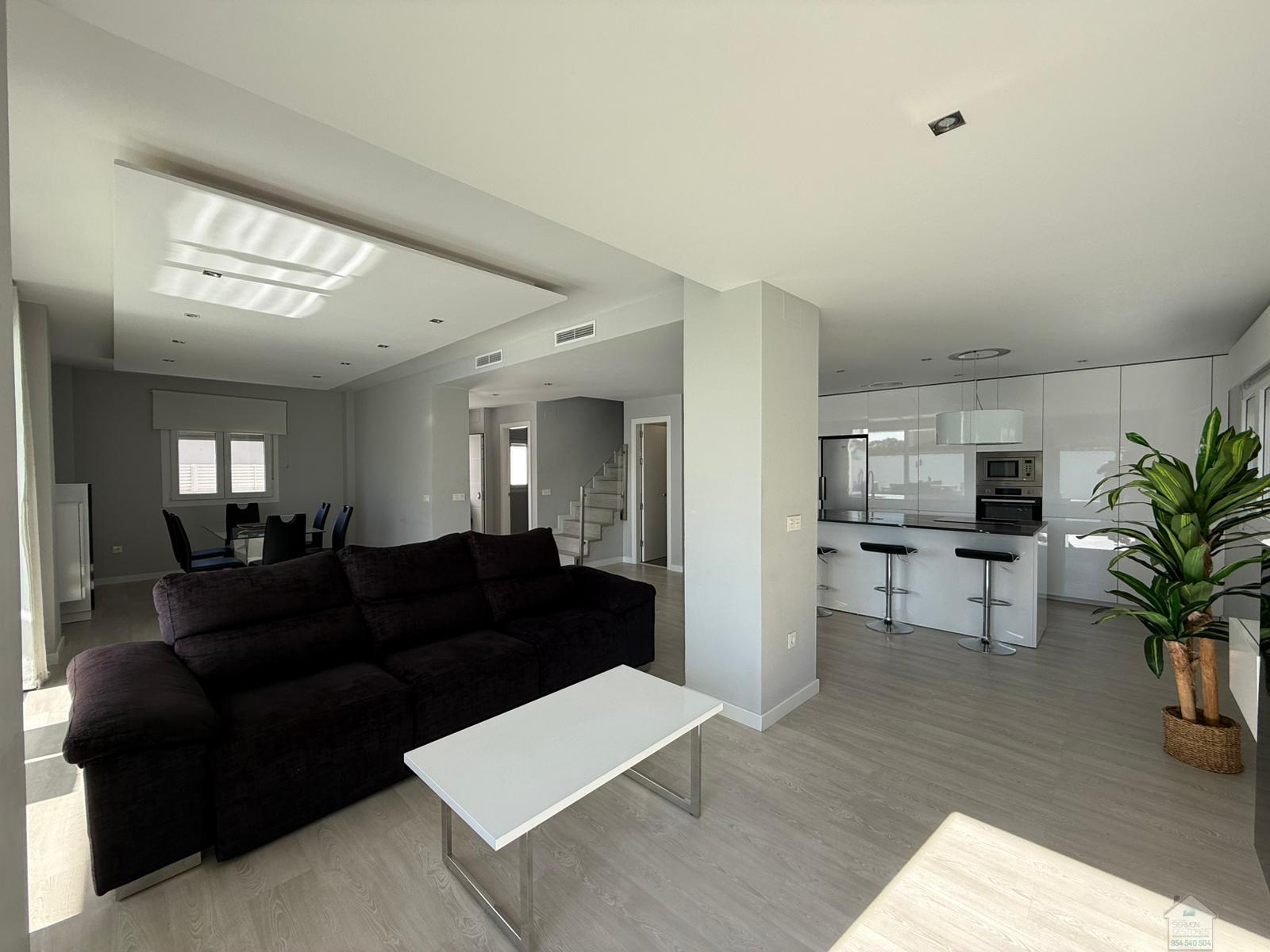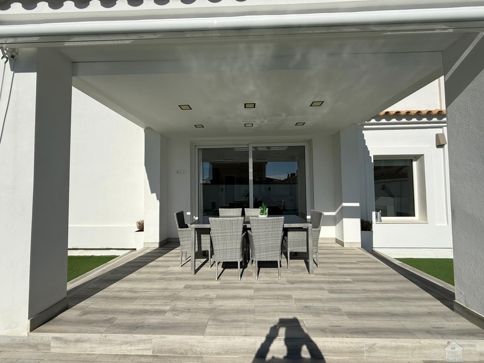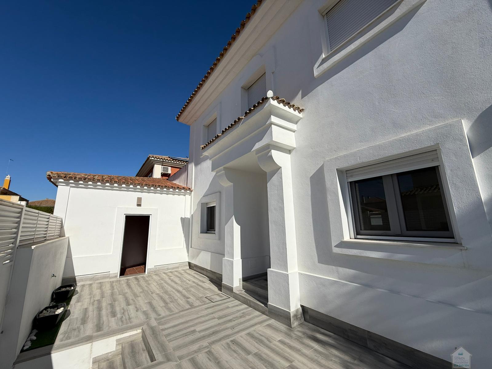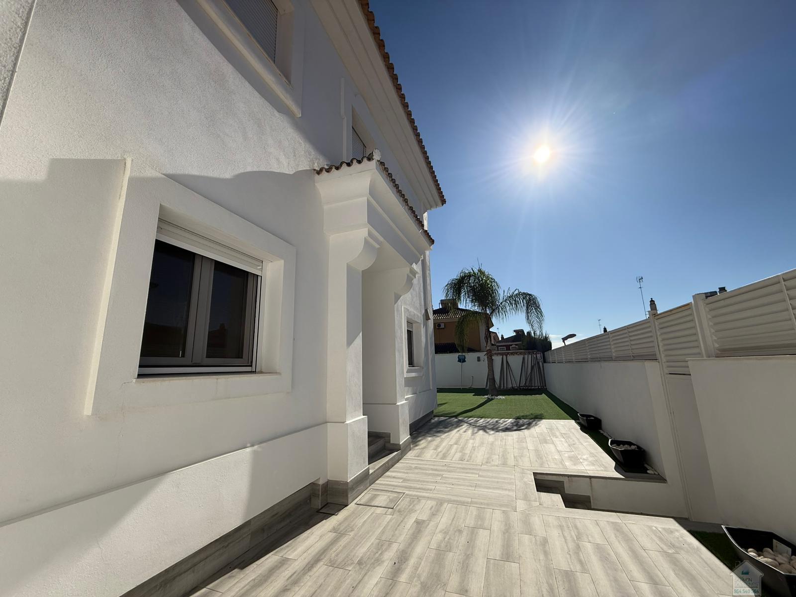 CHALET EN SEVILLA,DOS HERMANASChalet 5 dormitorios, 2 baños, 2 garajes, Buen estado, en Dos Hermanas, Sevilla Alquiler chalet independiente en Olivar de quintos, Montequinto. Situado dentro de un pasaje privado, ofreciendo tranquilidad, seguridad e intimidad. La vivienda consta de 230 metros cuadrados construidos y 418 metros de parcela. En su entrada, un recibidor que nos conduce al salón y cocina integrada, todo diáfano, luminoso y con salida al porche y piscina. En esta planta hay una habitación y un aseo. La planta superior cuenta con un distribuidor que nos dirige a cuatro habitaciones. Una de ellas la habitación principal, con baño propio y vestidor. El último de los baños también se encuentra en esta planta. La zona exterior, amplia, zona de estar cubierta y con una gran piscina en la que disfrutar de la familia y amigos. La casa cuenta con garaje cubierto y capacidad para dos/tres coches. Además, en la fachada de la vivienda, dentro del pasaje se puede también estacionar. No dudes en llamar y estaremos encantados de hacer una visita. |