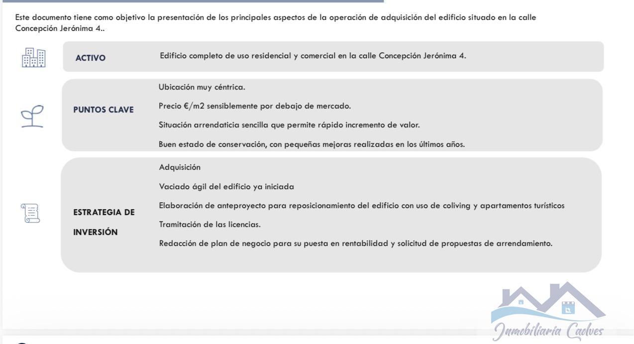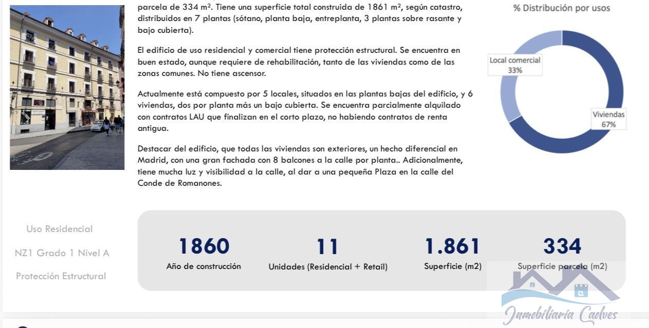 EDIFICIO EN MADRID,MADRIDEdificio 0 dormitorios, 0 baños, 0 garajes, Para reformar, en Madrid, Madrid CAOLVES INMOBILIARIAVENDE EDIFICIO EN MADRIDSUPERFICIE CONSTRUIDA 1.861 M2 PARCELA 334M2 Distribución actual: 5 locales comerciales y 6 viviendas, todas exteriores, mas bajo cubierta.Situación actual el edificio ya esta vacío, sin rentas antiguas,lo que facilita un vaciado rápido y reposicionamiento.Proyecto de reforma: Hay anteproyectos de coliving,cohousing y apartamentos turísticos, con posibilidad de hasta 24 unidades legales más 2 adiciones segun los planos preliminares.Obra estimada 3,5 M (inluyendo la parte estructural), ya valorada por una constructora.Posibilidades de uso Turistico, residencial ,coliving o cohousing. También podría explorarse cambio de uso a hotel, sujeto a consulta urbanística. |