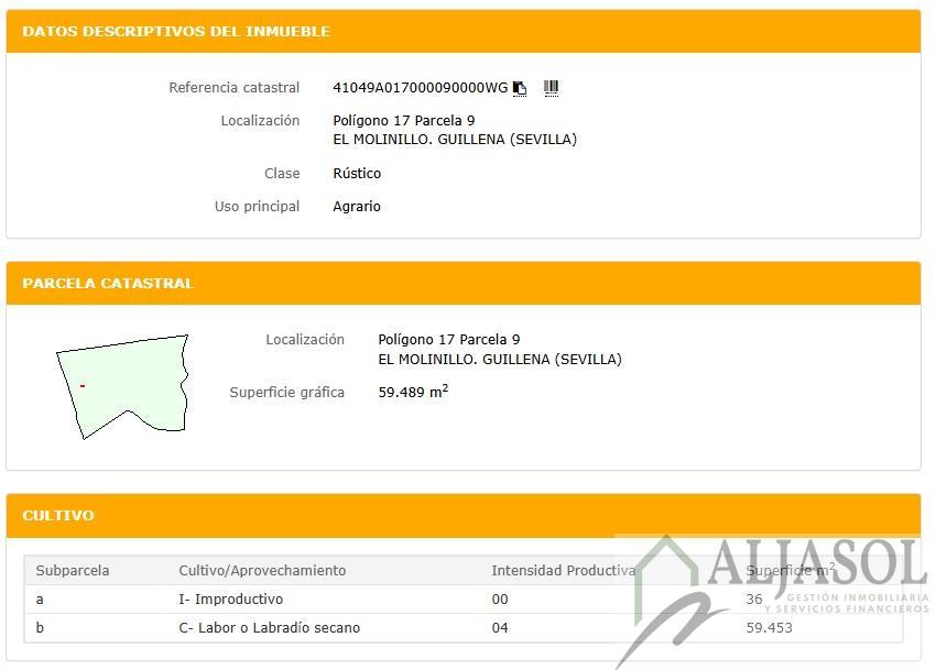 FINCA RUSTICA EN SEVILLA,GUILLENAFinca Rustica 0 dormitorios, 0 baños, 0 garajes, Buen estado, en Guillena, Sevilla Referencia: 2758 AljasolTipo de propiedad: Finca rústica de secanoSuperficie: 59.489 m²Construcciones:Cuarto de aperos banderizado de 50 m²Cercado incluidoInformación adicional:Gastos de notaría, registro, honorarios de agencia e impuestos no incluidos en el precioFicha Informativa Abreviada (F.I.A.) disponible para el consumidorContacto:Puede ponerse en contacto con el anunciante o el agente inmobiliario responsable para ampliar información o concertar visita. |