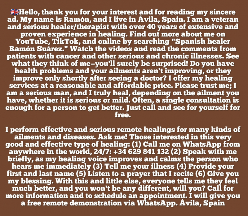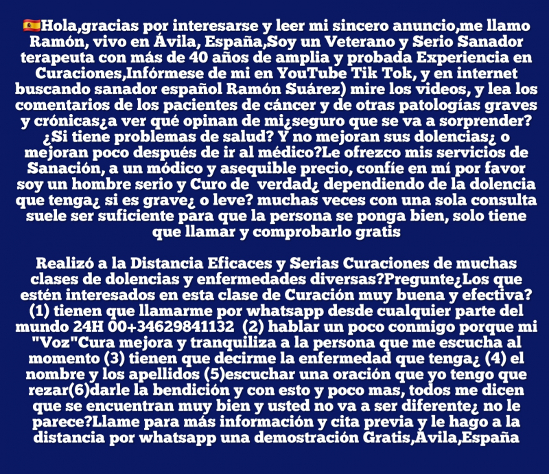 SANADOR ESPAñOL OFRECE EFICACES Y SERIAS CONSULTAS A LA DISTANCIA POR WHATSAPP 00+34629841132Hola,gracias por interesarse y leer mi sincero anuncio,me llamo Ramón, vivo en Ávila, España,Soy un Veterano y Serio Sanador terapeuta con más de 40 años de amplia y probada Experiencia en Curaciones,Infórmese de mi en internet buscando sanador español Ramón Suárez)¿Si tiene problemas de salud? Y no mejoran sus dolencias¿ o mejoran poco después de ir al médico?Le ofrezco mis servicios de Sanación, a un módico y asequible precio,haga Clic por favor en los enlaces o copiélos para ver los vídeos y leer los comentarios de los pacientes de cáncer y de otras patologías graves y crónicas¿a ver qué opinan de mi¿seguro que se va a sorprender? https://youtu.be/Z62KCnv7ntI https://www.tiktok.com/@sanadorgallego?_t=ZN-8wnHYPGWHCA&_r=1 https://youtu.be/vPTGAN69Xn8 https://youtu.be/3oDJhp-9DDQ https://youtu.be/3zVsinF3I4k https://youtu.be/528FKJzoS8I Realizó a la Distancia Eficaces y Serias Curaciones de muchas clases de dolencias y enfermedades diversas?Pregunte¿Los que estén interesados en esta clase de Curación muy buena y efectiva? (1) tienen que llamarme por whatsapp desde cualquier parte del mundo 24H 00+34629841132 (2) hablar un poco conmigo porque mi "Voz"Cura mejora y tranquiliza a la persona que me escucha al momento (3) tienen que decirme la enfermedad que tenga¿ (4) el nombre y los apellidos (5)escuchar una oración que yo tengo que rezar(6)darle la bendición y con esto y poco mas, todos me dicen que se encuentran muy bien y usted no va a ser diferente¿ no le parece?Llame para más información y cita previa y le hago a la distancia por whatsapp una demostración Gratis,Ávila,España Hello, thank you for your interest and for reading my sincere ad. My name is Ramón, and I live in Ávila, Spain. I am a veteran and serious healer/therapist with over 40 years of extensive and proven experience in healing. You can find me online by searching "Spanish healer Ramón Suárez." Are you experiencing health problems and your ailments aren't improving, or are they only improving shortly after seeing a doctor? I offer my healing services at a reasonable and affordable price. Please click on or copy the links to watch videos and read testimonials from patients with cancer and other serious and chronic illnesses. See what they think of me—you'll be surprised! https://youtu.be/Z62KCnv7ntI https://www.tiktok.com/@sanadorgallego?_t=ZN-8wnHYPGWHCA&_r=1 https://youtu.be/vPTGAN69Xn8 https://youtu.be/3oDJhp-9DDQ https://youtu.be/3zVsinF3I4k https://youtu.be/528FKJzoS8I Did he perform effective and serious remote healings of many kinds of ailments and diseases? Those interested in this very good and effective type of healing, please ask. (1) You have to call me on WhatsApp from anywhere in the world, 24/7: +34 629 841 132. (2) Talk to me for a bit because my "Voice" heals, improving and calming the person who listens to me instantly. (3) You have to tell me what illness you have. (4) Your first and last name. (5) Listen to a prayer that I have to say. (6) I give you my blessing. With this and little else, everyone tells me they feel much better, and you won't be any different, don't you think? Call for more information and to schedule an appointment, and I'll give you a free demonstration remotely via WhatsApp. Ávila, Spain |