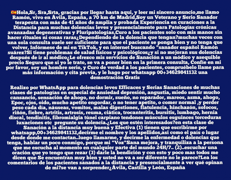 SANADOR ESPAñOL OFRECE EFICACES Y SERIAS CONSULTAS PRESENCIALES Y A LA DISTANCIA POR WHATSAPPHola,Sr, Sra,Srta, gracias por llegar hasta aqui, y leer mi sincero anuncio,me llamo Ramón, vivo en Ávila, España, a 70 km de Madrid,Soy un Veterano y Serio Sanador terapeuta con más de 41 años de amplia y probada Experiencia en curaciones a la Distancia para muchas dolencias leves y presencialmente para Patologías crónicas avanzadas degenerativas y Pluripatologías,Curo a los pacientes solo con mis manos sin hacer rituales ni cosas raras¿Dependiendo de la dolencia que tengan?muchas veces con una sola consulta suele ser suficiente para que el paciente se ponga bien y no tenga que volver, Infórmese de mi en TikTok, y en internet buscando "sanador español Ramón suárez?Si tiene problemas de salud físicos y psicológicos¿y si no mejoran sus dolencias después de ir al médico¿Le ofrezco mis servicios de Sanación a un módico y asequible precio Seguro que si yo le trato, se va a poner bien en la primera consulta, Confíe en mi por favor, soy un hombre serio, y Curo de verdad a los pacientes, compruébelo llame para más información y cita previa, y le hago por whatsapp 00+34629841132 una demostración Gratis Haga clic por favor en los enlaces o cópielos, para ver los vídeos y leer los comentarios de pacientes, oncológicos y de otras situaciónes de salud delicada?a ver qué comentan de mi? Se van a sorprender¿ https://youtu.be/Z62KCnv7ntI https://www.tiktok.com/@sanadorgallego?_r=1&_t=ZN-956dWstV2Jy https://youtu.be/vPTGAN69Xn8 https://youtu.be/3oDJhp-9DDQ https://youtu.be/3zVsinF3I4k https://youtu.be/528FKJzoS8I Realizo por WhatsApp para dolencias leves Efficaces y Serias Sanaciones de muchas clases de patologías en especial de ansiedad depresión, angustia, miedo sentir mucho cansancio, sensación de ahogo, no dormir, sueño, no reparador, mareos, asma, ahogo, Epoc, ojos, oido, mucho apetito engordar, o no tener apetito, o comer normal ,y perder peso cada día, náuseas, vomitos, malas digestiones, flatulencia, hinchazón, sofocos, riñón, fiebre, artritis, artrosis, reuma, ciática, trocanteritis, bursitis, lumbago, hernia discal, tendinitis, fibromialgia túnel carpiano tendones músculos esguinces torceduras luxaciones etc pregunte su dolencia.¿Los que estén interesados?en esta clase de Sanación a la distancia muy buena y Efectiva (1) tienen que escribirme por whatsapp,00+34629841132,decirme el nombre y los apellidos,asi como el país o lugar desde donde me contactan..luego llamarme, y decirme la enfermedad o dolencias que tenga, hablar un poco conmigo, porque mi "Voz"Sana mejora, y tranquiliza a la persona que me escucha al momento en cualquier parte del mundo 24H/7.. (2)..escuchar una oración que yo tengo que rezar (3) darle la bendición y con esto y poco mas todos me dicen que Se encuentran muy bien y usted no va a ser diferente no le parece?Lea los comentarios de los pacientes sanados a la distancia y presencialmente a ver qué opinan de mi?se van a sorprender¿Ávila, Castilla y León, España |