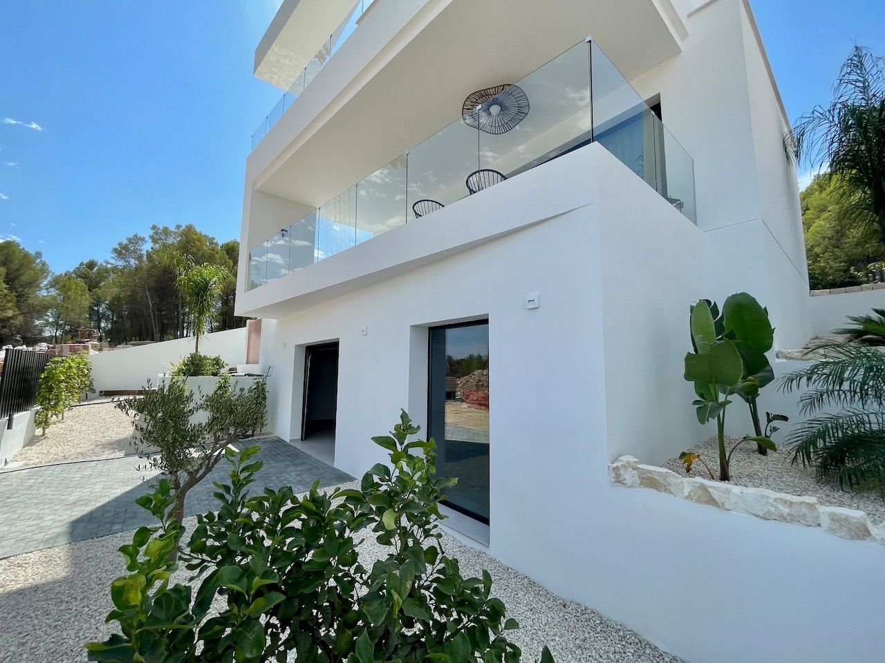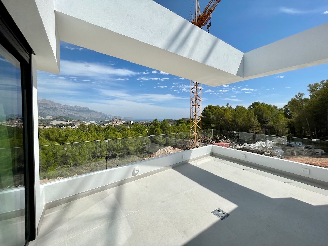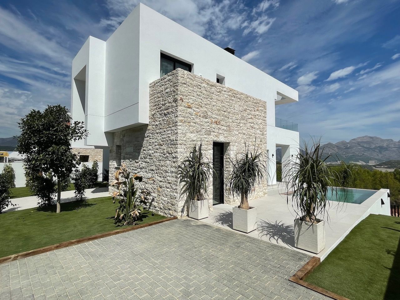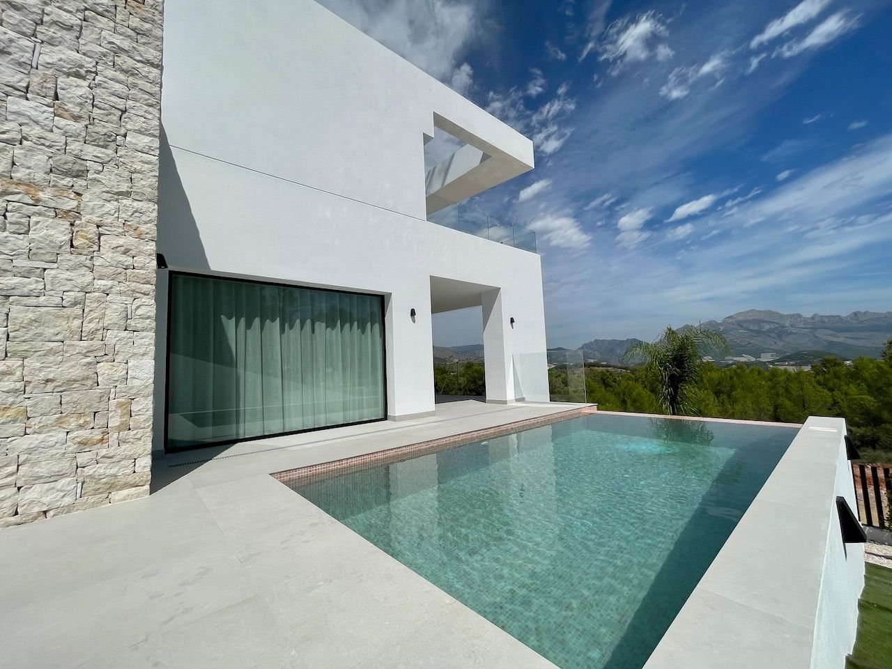 VILLA EN ALICANTE,POLOPVilla 3 dormitorios, 3 baños, 1 garajes, Nuevo, en Polop, Alicante Moderna villa con tres dormitorios y sótano con garaje. Esta luminosa villa tiene bonitas vistas a la montaña y al mar. Dispone de tres plantas. En la planta principal tenemos el salón con la cocina americana, chimenea decorativa y la salida al jardín con la piscina. En esta planta también tenemos un dormitorio con baño en suite. Desde esta planta a través de la moderna escalera interior, se accede a la planta superior en la que tenemos dos dormitorios, uno de ellos con terraza, vestidor y baño en suite y el otro con el baño en suite y terraza. En la planta sótano, a la que también accedemos por la escalera interior, tenemos una sala multiusos, un trastero y un gran garaje. La villa esta excelentemente equipada. Dispone, entre otros equipamientos, de jardín, piscina desbordante salina, aire acondicionado, cocina equipada, domótica, puerta acorazada, armarios terminados en el interior, chimenea, persianas motorizadas, calefacción radiante salvo en el garaje, etc. La villa tiene una superficie construida de 154,16 m2 a la que si se la añade la construcción de terrazas y piscina se obtiene un total de 293,85,m2 de construcción. |