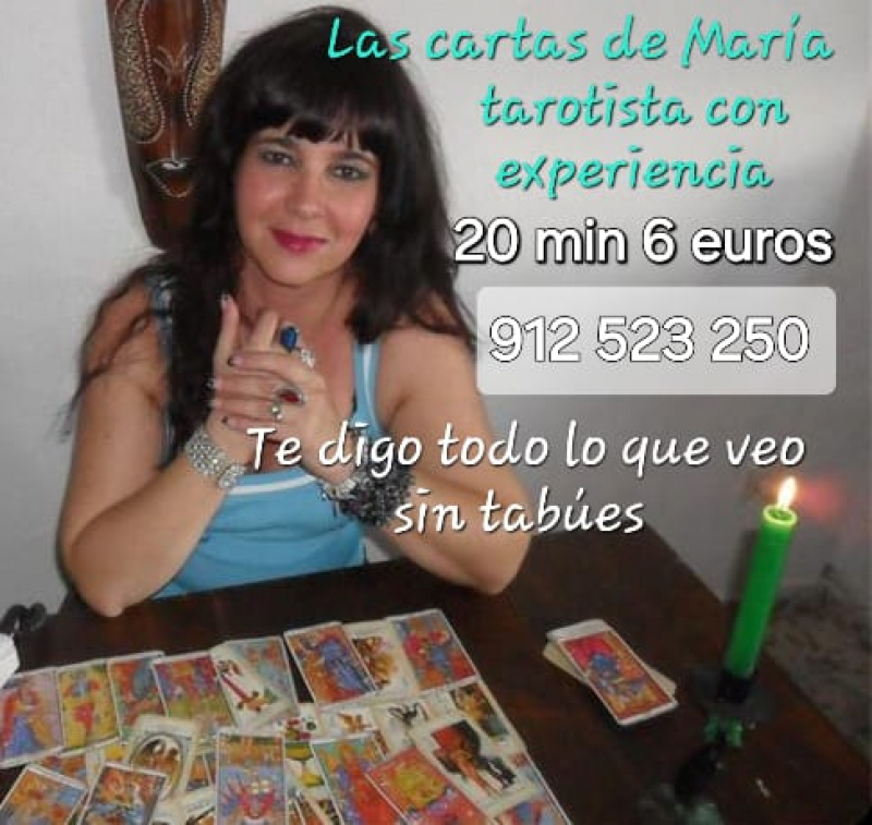 Tarot y videncia María Bénitez experiencia desde 1991. En un mundo dominado por la incertidumbre yo te daré respuestas honestas sin sonsacarte información te proporcionaré detalles que solo tú conoces con tarifas honestas y accesibles para todos. Puedes realizar una consulta espiritual llamando al teléfono 912 523 250 llamada de coste normal libre de tarificación adicional Decide el tiempo que necesites, podrás abonar la sesión mediante tarjeta. 15 minutos 5 euros 20.. minutos 6 euros 30 minutos 10 euros 60 minutos 20 euros Quienes consultan siempre vuelven..Servicio espiritual serio y profesional.Leer mas >>