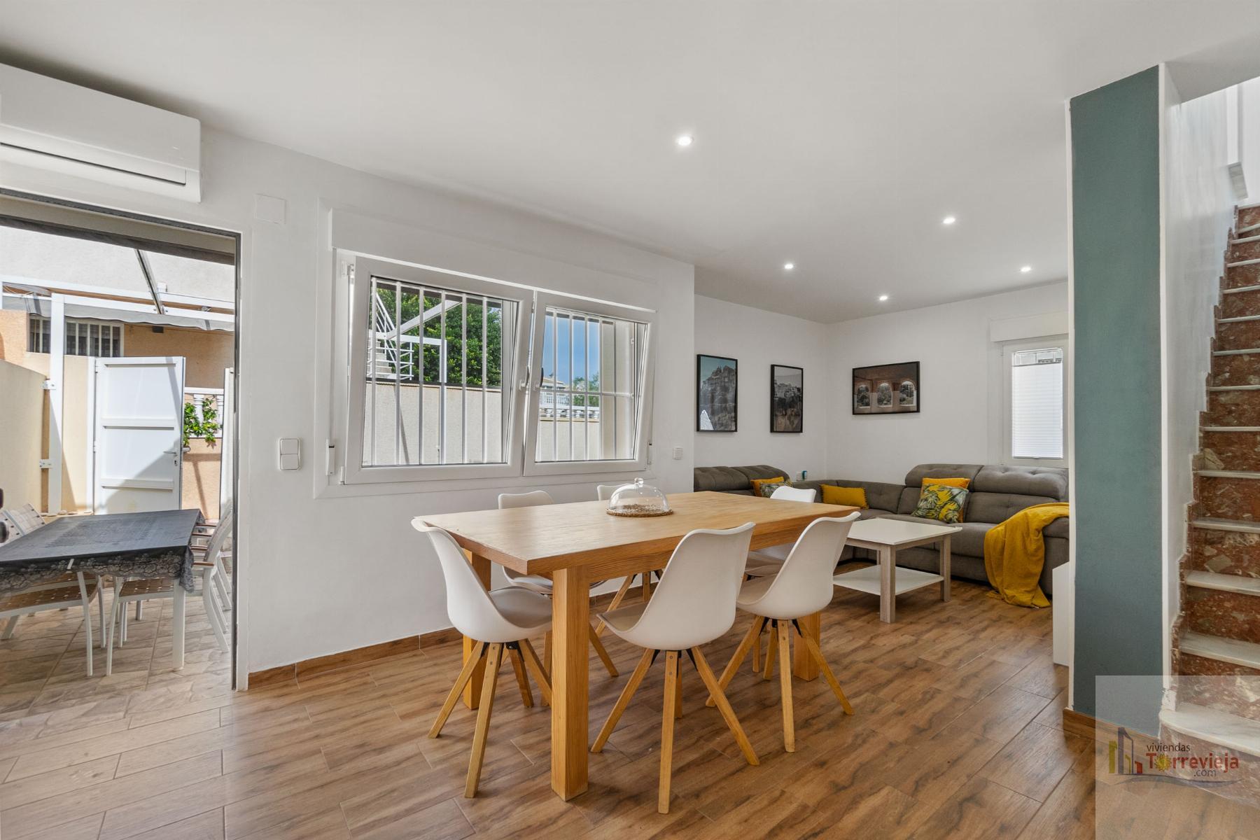 Casa 3 dormitorios, 2 baños, 1 garajes, Buen estado, en Torrevieja, Alicante ¡Presentamos este magnífico chalet renovado en Los Altos de Torrevieja! Ideal para quienes buscan comodidad y una ubicación estratégica, esta vivienda se encuentra cerca del colegio, lo que la convierte en una excelente opción para familias. Con 3 dormitorios y 2 baños, ofrece un diseño práctico y funcional. En la planta baja, encontrarás un dormitorio.. perfecto para aquellos que prefieren evitar escaleras, además de un amplio espacio exterior donde podrás disfrutar de comidas al aire libre y aparcar tu coche cómodamente.En la planta superior, hay dos luminosos dormitorios, ambos con acceso directo a un solárium donde podrás relajarte y disfrutar del clima. La propiedad forma parte de un residencial con piscina comunitaria, ideal para disfrutar en los días soleados.¡No pierdas la oportunidad de vivir en una de las mejores zonas de Torrevieja con todos los servicios cerca! Leer mas >>