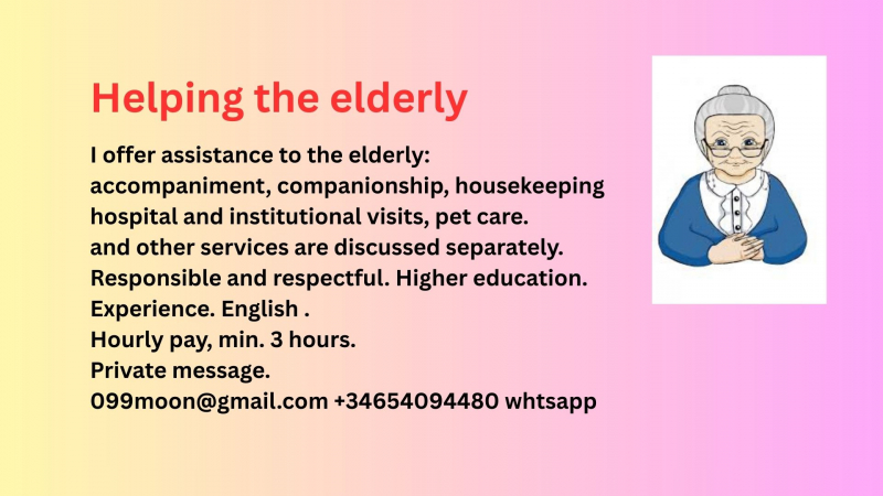 I offer reliable and caring assistance for elderly people and their families. Services include: Companion services: conversation, walks, social support Accompaniment to hospitals, clinics, banks, and other institutions Help around the house: light cleaning, simple cooking, grocery shopping Medication reminders Pet care Short-term or regular assistance What I offer: Calm and respectful attitude Responsibility and attention to detail Personalized care based on indi..vidual needs Available for one-time or ongoing support. Please contact me via direct message to discuss details.Leer mas >>
